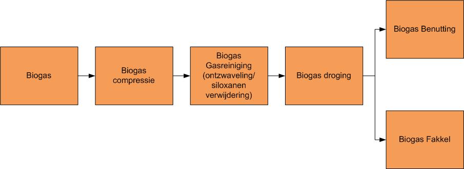In veel gevallen moet (bio)gas geconditioneerd worden en behandeld worden voordat het als brandstof nuttig ingezet kan worden. In onderstaand PFD worden deze behandelingsstappen weergegeven. Doelstelling is dat het biogas schoon en droog wordt geleverd aan een ketel-, gasmotor- of groengas installatie.